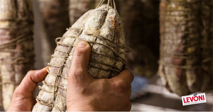 Levoni bruker bare det beste kjøttet fra utvalgte produsenter. De er nøye på modningstid, hvilke tresorter de bruker til å røke skinkene med og de bruker kun ferske krydder og friske urter.