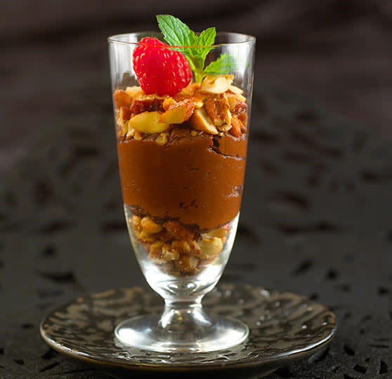 i en sprøytepose. Grovhakk nøttene og legg litt i bunnen av glassene, sprøyt sjokoladekrem oppå og avslutt med nøtter. Legg på et friskt bringebær og frisk mynte.