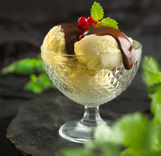 Lag kuler av isen og legg i avkjølte skåler. Hell sjokoladesausen over isen og legg på rips og sitronmelisse.