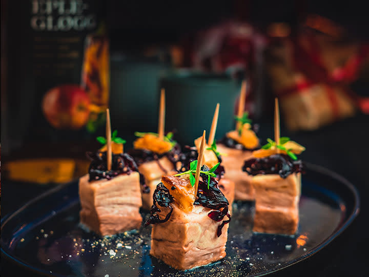 Ribbe og eple er en nydelig kombinasjon. Her er ribben servert med en rødkål som er smaksatt med Jacobs Utvalgte Eplegløgg – en nydelig hvit gløgg. Å lage kanapeer av ribbe til gløggen er en smart måte å bruke opp ribberestene på. Du kan også kjøpe ferdigstekt ribbe hos MENY.