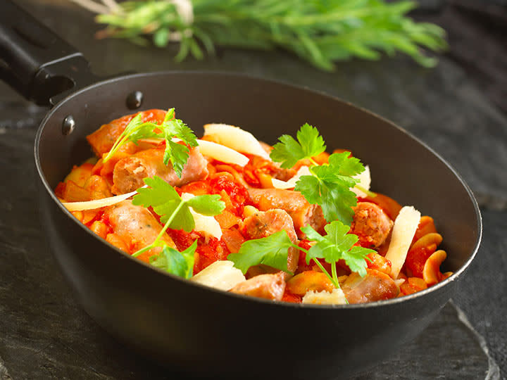 i 4 cm store biter og ha den i tomatsausen. Kok pastaen