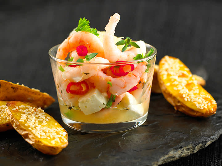 Hakk tomater og urter og bland med reker og fetaost. Hell over saften fra en appelsin. Sett i kjøleskap i 1 time. Hell av overflødig væske og ha på olivenoljen. Smak til med salt og pepper. Anrett i glass. Del potetene på langs, pensle med olje og dryss over sesamfrø. Stek i stekeovn ved 210 °C til potetene er møre.