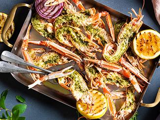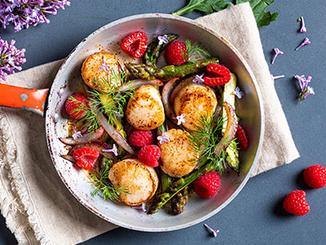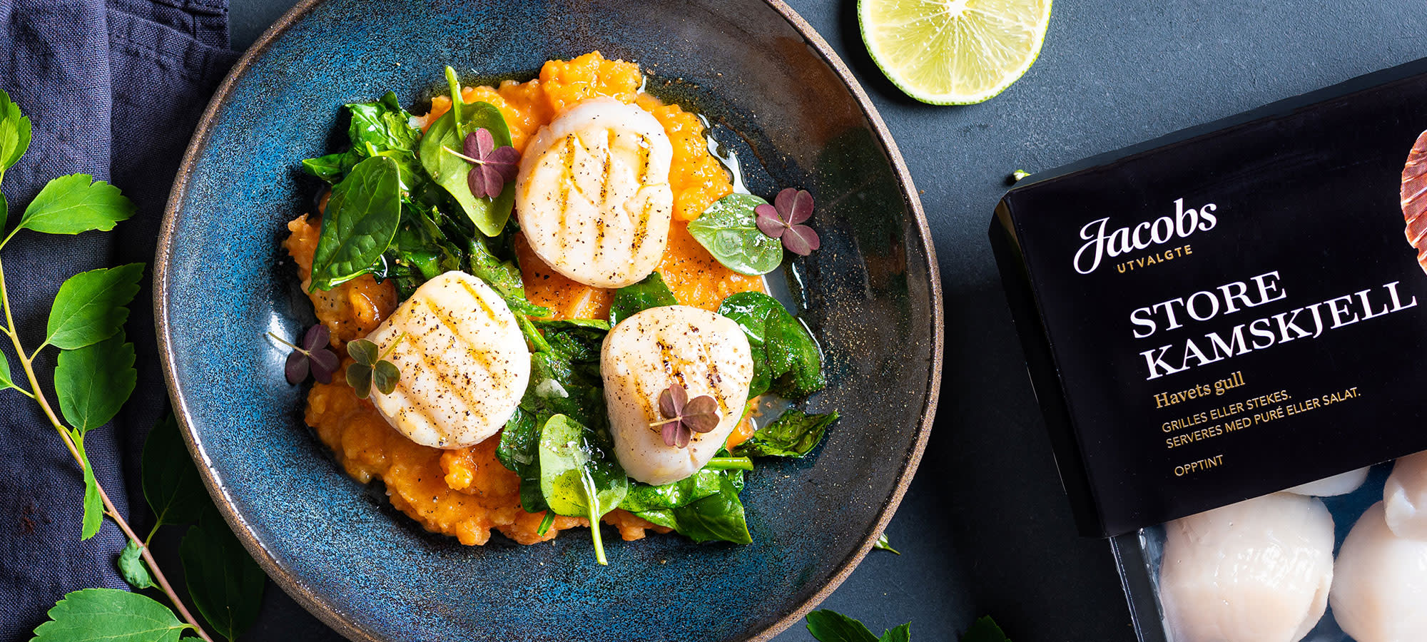 Stek kamskjellene i smør til de er gylne og akkurat gjennomstekte. Dette tar ca 2 minutter på hver side. Varm opp gulrotpuréen. Bland salaten med limesaft og olivenolje. Anrett gulrotpuréen på to tallerkener og topp med salat og kamskjell.