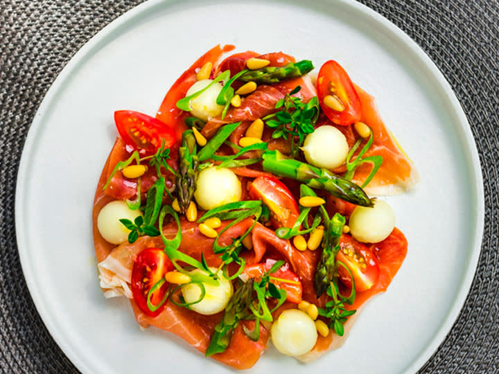Parmaskinke med melon er en klassiker, og egner seg godt som forrett eller som tilbehør til grillmaten. Kombiner gjerne parmaskinke og melon sammen med tomater, asparges, samt pinjekjerner for en smakfull og frisk salat.