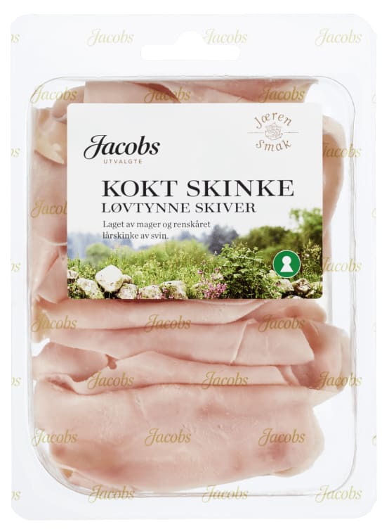 Jacobs Utvalgte Kokt skinke er laget av mager renskåret lårskive av svin, smaksatt med salt og krydder. Skinken er skåret i løvtynne skiver og er et smakfullt pålegg på brødskiven eller i en god wrap.
